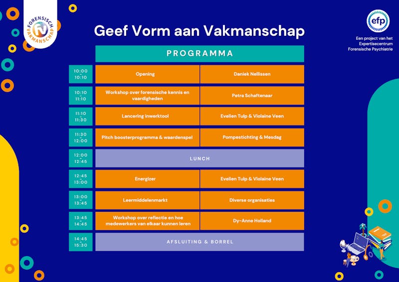 Op 26 november 2025 organiseert het EFP vanuit het project Forensisch Vakmanschap: Geef vorm aan Vakmanschap. Een dag vol inspiratie, voor iedereen die verantwoordelijk is voor het opleidingsbeleid in een forensische zorg organisatie, of hier een grote rol in speelt. Het thema van deze dag is: de nieuwe medewerker. Ben jij bijvoorbeeld een HR-medewerker, scholingsverantwoordelijke, trainer of manager. Dan is deze dag interessant voor jou!