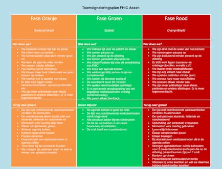 De FHIC afdeling van FPK Assen, GGZ Drenthe heeft hiervoor het teamsignaleringsplan ontwikkeld. Het team maakt onderscheid in het signaleringsplan tussen fase oranje (onderprikkeling), fase groen (stabiel) en fase rood (overprikkeling). Hierbij wordt beschreven wat zij als team doen en laten zien in elke fase én hoe zij terug kunnen naar fase groen. In fase groen is het team het meest stabiel, forensisch scherp en in staat om goede begeleiding te kunnen bieden aan de patiënten.